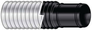 For bilge pump discharge applications. Single layer corrugated polyethylene. Resistant to: mild chemicals, salt water. Clamping cuff every foot. Do not attach to thru hull fitting below the water line.