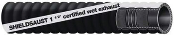 Shieldsaust- C Hose has a black synthetic rubber tube and cover. Reinforced with double wire helix imbedded between plies of synthetic cord and is abrasion resistant. Resistant to exhaust fumes, ozone, mild chemicals, antifreeze, and saltwater. Primarily used for wet exhaust connections with significant bends, engine intake and scupper lines. Temperature ranges from -20°F to + 200°F continuous, +250°F intermittent. It has double the ozone resistance required by SAEJ2006. Meets SAE J2006 Type R2 standards