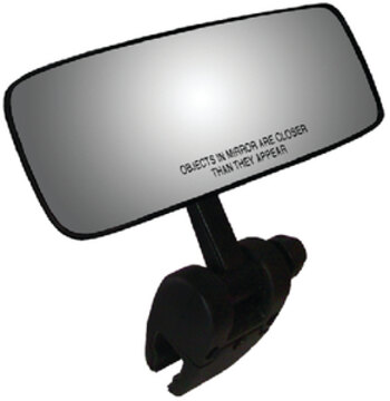 Approximately 98 square inches for the ultimate in boating safety. Perfect for competitive water sports and it\'s considered a tournament standard in safety. Features OE grade shatterproof convex safety glass, and meets QS9000 and ISO 9002 standards. OE grade first surface coating provides a high quality image that eliminates symptoms such as ghosting and multiple reflections. The result is a crisp clear view. It sits approximately 3\" above the windshield. The aluminum bracket has a black textured finish and attaches to the windshield using a quick and easy clamp-on design. Mounts to windshield frames from 3/8\" to 1\" in diameter.