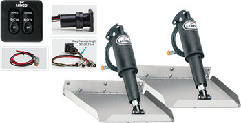 Ideal for boats with a swim platform and/or ladder. They can be fitted to transoms that have a limited mounting area. Blades are 12 gauge, 304 SS with front of blade folded to provide a smooth trailing edge and 1/8\" diameter hinge pin. Fast response electric actuators for precise control. All units have Plug and Play connections and are fully submersible. Minimum transom height = 13\". 2\" Hinge.