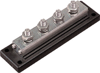 This Buss Bar Screw-Terminal Block is equipped with two each #10-24 studs for main wire connection. Constructed of tin plated brass and ABS. Designed for use with tinned copper marine wire which shares the same expansion rate to prevent loosening wires and reducing electrolytic corrosion caused by pairing two disparate metals. Maximum: 48VDC, 100 amps. Installs with two #10 RH fasteners (not included).