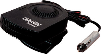 ABS Housing. Works great for keeping small windows clear of condensation. Not intended for cabin heating in large areas. Comes with 5-1/2 foot cord and plugs into 12 volt power socket. Base pivots and rotates and can be attached with velcro strips.