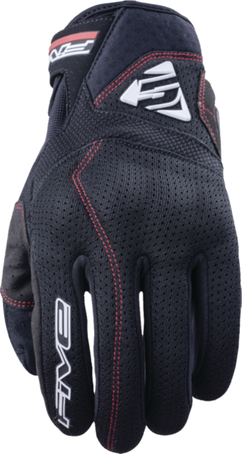 Roll, breathe!\nThis ultra-ventilated summer glove, with its topside slim-cell Mesh construction and Airprene wristband, is a clear choice for those looking to ride in the heat. It features PU shells on the topside and a TPR palm slider for protection. Durable synthetic leather palm, topside of the hand and inside of the thumb in Q-Span, an ultra-elastic material used in motocross, promising optimal fit. Sonic FIVE logos and double red topstitching provide just the right dose of character to the black coat on this summer glove thats understated, but truly effective.\n Mesh and Q-Span fabric construction topside for optimal ventilation\n Synthetic leather palm for durability\n PU metacarpal-knuckle protection and shock-absorbent foam\n Protective TPR palm slider shell\n Lycra fourchettes and comfort gusset for optimal fit\n Airprene cuff for adjustment, comfort, and ventilation\n Closure system with Sonic TPR tab + Velcro and synthetic leather on-off pull tab