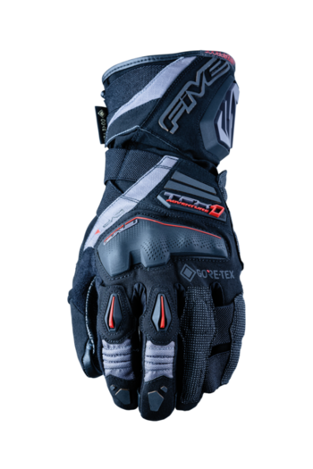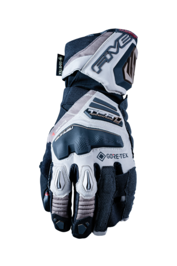 When you head off to into uncharted territory at the wheel of a machine made to devour thousands of miles, its only right to expect the finest in comfort, safety, and durability. This is exactly what youll get from the TFX1 GTX, a brand-new style in the FIVE Trail Adventure range and our premium offering in this category. It includes materials and a design that make it the ultimate in grand touring equipment.\n\nTechnical features:\n Topside: Water-repellent stretch and RipStop fabric construction for weatherproofing and comfort\n Palm: full-grain goat leather for suppleness, and digitalized leather reinforcement at contact points for optimal grip in wet weather, and wide Superfabric protective reinforcement that covers the thenar eminence and the hypothenar\n GORE-TEX Grip breathable, weatherproof membrane molded to the lining on the palm side\n FIVErgo Protech one-piece metacarpophalangeal protective shell in soft TPR\n Memory-foam and TPR reinforcement on the back of the hand\n Phalangeal protective elements in soft TPR on the index and middle fingers\n Forearm protection with a thick, semi-soft TPR 3D shell\n Wide SuperFabric reinforcement on the little and ring fingers\n Anti-twist accordion strap between the little and ring fingers so your fingers dont get pulled apart if you fall (a FIVE innovation)\n Comfort gusset on the index and middle-finger joints\n Outside seaming on the fingers\n Memory-foam reinforcements on the thumb and palm\n Silicone print on the palm for improved grip\n Inner lining featuring map-style silk-screened design\n Stretch V-shape and Velcro dual-construction closure system with gripper tab, one on the wrist and the other on the sleeve, for perfect fit\n Pull & Ride tab for easy on/off\n 3D reflective patches\n Clear Vision Pad visor-cleaning system on the left-hand side\n TouchScreen system (index finger and thumb) for handling electronic devices