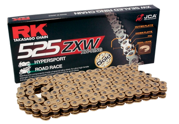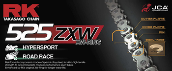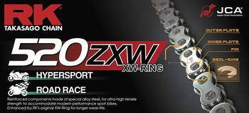 RKs flagship model; the ZXW Series were developed to meet the specifications of the latest models of extreme superbike 1000cc and above. They feature MotoGP and FIM 8-Hour Endurance technology and has proven its superiority by winning 35 first place finishes out of 39 races at the FIM Suzuka 8-Hour Endurance Race. They are designed to be the strongest, long-lasting premium quality XW-Ring equipped chain available on todays market, with highest tensile strength of RK series and high rigidity for instant respond on acceleration. RKs ZXW series chains are ideal for high-speed, high-horsepower performance applications, large displacement and extended swingarm machines in race or street use.\n\nXW-Ring seals provides three contact lips and two lubrication pools to protect against dirt and debris, high-speed abrasion, heat buildup and the loss of lubricant under extreme conditions. Thats a fancy way of saying XW-Ring seals make your chain last longer. When RK develops a chain with a combined heritage of both drag racing and extreme endurance racing, riders can rest assure that theyre getting the best of both racing worlds.\n\n Tensile strength: 10,430 lbs\n Max cc rating: 1,300cc\n Max horsepower: 220 HP\n Wear Life index: 4,100\n Master link Included: Rivet type