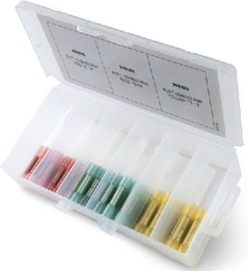 Features tinned copper for maximum current flow and corrosion resistance. Adhesive lined heat shrink tubing shrinks to form a tight seal and the ultimate in vibration and strain relief. Reusable 250 piece clear jar has a flip lid for ease of use.