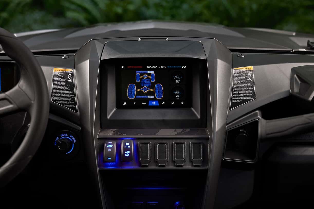 • For accessibility in low-light conditions, the Wolverine RMAX4 1000 SE features an interior light package to easily navigate controls. The blue LED lighted switches, floor lights and console lighting complement the automotive-inspired cockpit and are color-matched to the blue-backlit meter for a high-quality feel and premium look.