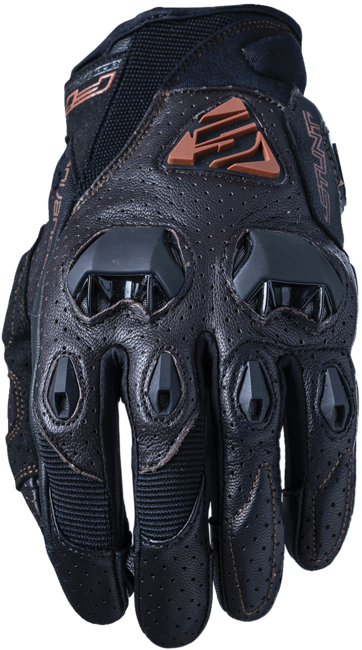 Here we present the ventilated version of the STUNT EVO LEATHER, which includes perforated leather on the palm and on its topside construction, for considerable airflow in summer weather.\n Full-grain cowhide construction (topside) for durability, perforated for ventilation/perforated full-grain goatskin (palm) for suppleness\n Ventilated TPU metacarpal-knuckle and knuckle protective shells\n Protective Carbon/TPR palm slider\n Palm reinforcement in perforated Clarino\n Airprene and 4-way Spandex cuff\n 4-Way Spandex comfort panels\n Closure system with Clarino tab + Velcro and leather on-off pull tab\n TouchScreen system (thumb and index finger) for touch-screen handling