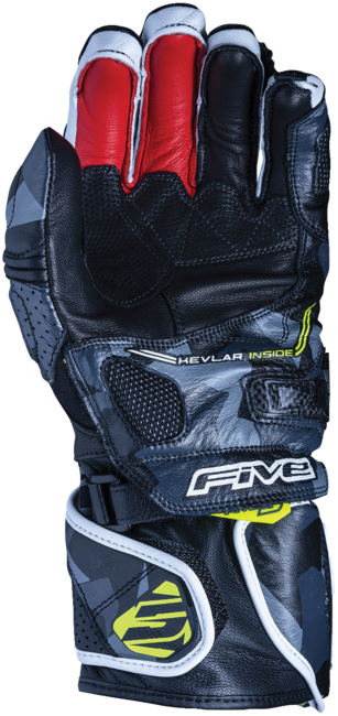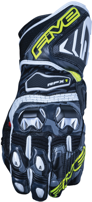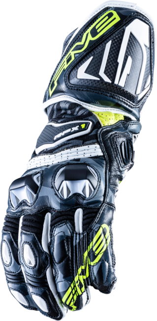 The RFX1 is a glove for a racing track and sports use. The RFX1 incorporates new hulls phalanges PU ventilated and wide hull protection of carbone forearms. It has all the characteristics of a high-end glove oriented performance. This upscale racing glove will delight the discerning sports machine drivers, who favor the sensitivity of the controls and the fitting, without neglecting safety. Signature V-Five\n\nPalm:\n Lining Kevlar Carbon reinforcements Full grain leather for protection Stretch Kevlar for ease Protecting both the palm than the upper region of the hand The Velcro adjustment tab is hidden under a leather safety panel bearing the risk of coming off during a fall\nBack:\n PU knuckle shells ventilated and wide protective shell of carbon forearm Adjustment for reduced weight