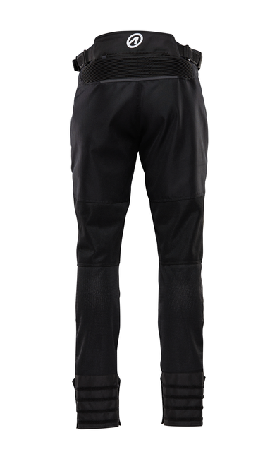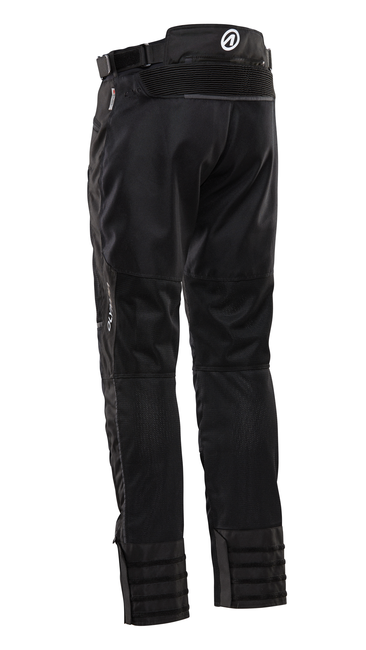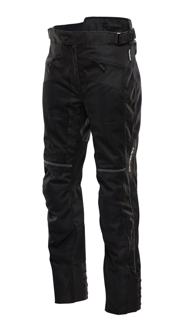 Perfect for Spring or hot Summer days, the Eve 2 trousers are highly ventilated with large air mesh panels. Reflective areas at the side of the legs ensure superior visibility at any time of the day or night. Also the Eve 2 is fully equipped with CE-approved level 2 armor, located in height adjustable knee pockets, allowing you to place the armor just the way you like it.\n\n Outer shell constructed in 500D and 1000D\n Ballistic airflow mesh panels\n Smooth Ways removable and adjustable knee pad\n Lower side leg zippers allow detachment of leg bottoms without removing boots\n Relaxed tailored fit\n Cool mesh airflow lining\n Removable EVA compression foam at hips\n Custom fit detailing at waist and bottom hem\n 3M Scotchlite reflective details\n 8-in connecting zipper for connects pants to jackets