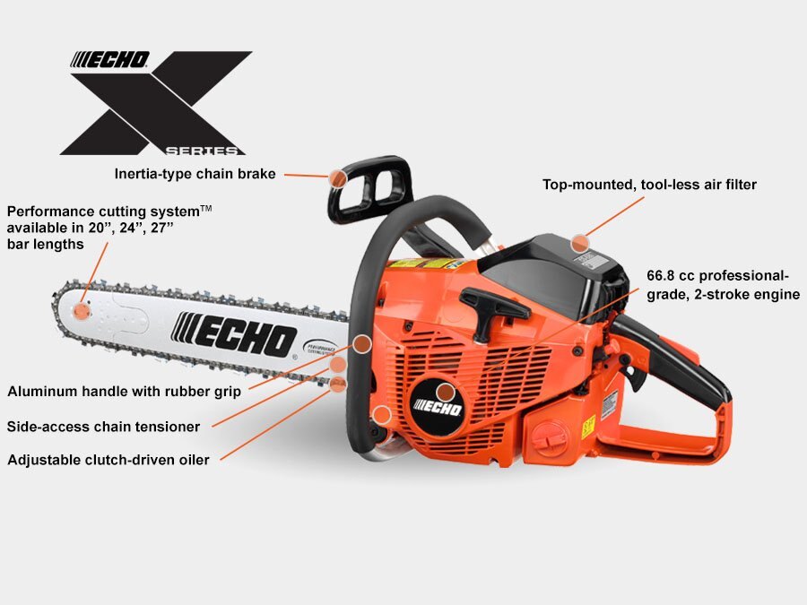 EXTREME ECHO POWER66.8 cc professional-grade, 2-stroke engine For outstanding performance and durability Performance Cutting System™ Features an upgraded bar and aggressive chain for improved cutting performance Aluminum handle with rubber grip Improves comfort and control Automatic, adjustable oiler with manual over-ride Allows the ability to match cutting conditions for reduced oil consumption Heavy-duty, easy-access, automotive-style air filter Provides superior filtration with reduced maintenance time Side-access chain tensioner For easy chain adjustments Available in 20., 24 and 27 in. bar lengths Perfect for large jobs |