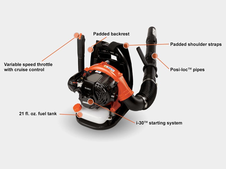 LIGHTWEIGHT AND LOW-NOISE25.4 cc professional-grade, 2-stroke engine For outstanding performance and durability Lightweight design and construction Makes this blower easy to carry for routine lawn maintenance Only 65 dB(A)* "Low noise output for noise sensitive environments * per ANSI B175.2-2012" i-30™ starting system Reduces starting effort by 30% Padded backrest and shoulder strap For operator comfort Variable-speed, hip-mounted throttle with cruise control Offers operator convenience 21.3 fl. oz. see-through fuel tank For quick fuel level checks Posi-loc™ pipes For a secure connection and maximum durability Padded backrest and shoulder straps Provide operator comfort |