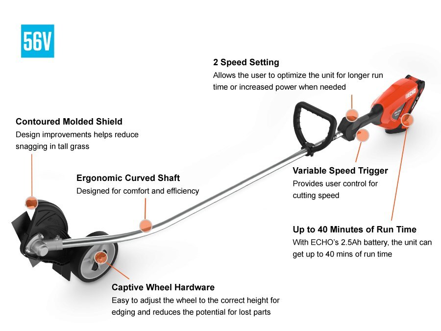 The 56V ECHO Battery System DPE-2100 is built with similar features as our gas-powered PE-225 so you can expect the same commercial-grade components when edging your property to give that professional look.