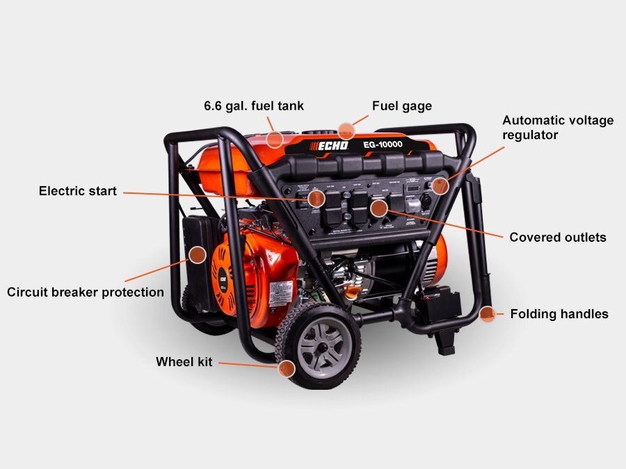 Major output for major needs. The EG-10000 generator runs quietly and is capable of efficiently producing 10,000 watts, enough to power large loads like jobsites, multiple home appliances and food trucks. An automatic voltage regulator also maintains constant power.