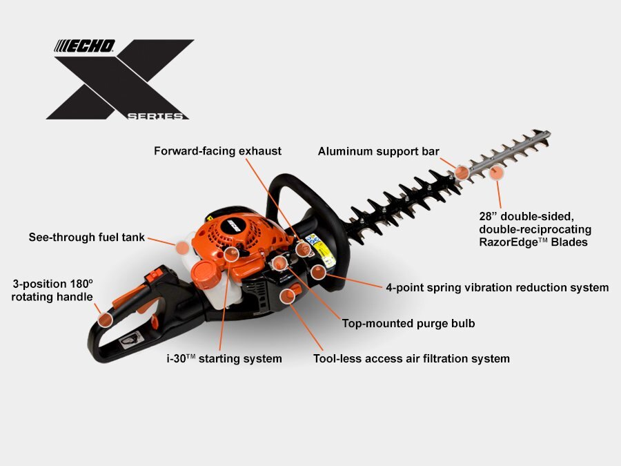 POWER AND PRECISION21.2 cc professional-grade, 2-stroke engine For outstanding performance and durability 3-position, 180-degree rotating rear handle Increases maneuverability and provides operation orientation options 28 in. double-sided, double-reciprocating RazorEdge® blades Feature three sharpened edges for more efficient cutting Aluminum U-channel support bar and cored-out blades Reduce weight for easier handling and fatigue reduction Front-facing exhaust Prevents plant damage Full-spring suspension system Reduces vibration for operator comfort i-30™ starting system Reduces starting effort by 30% Tool-less access air filtration system For easy and convenient in-field servicing 12.5 fl. oz. capacity see-through fuel tank For easy fuel level checks |