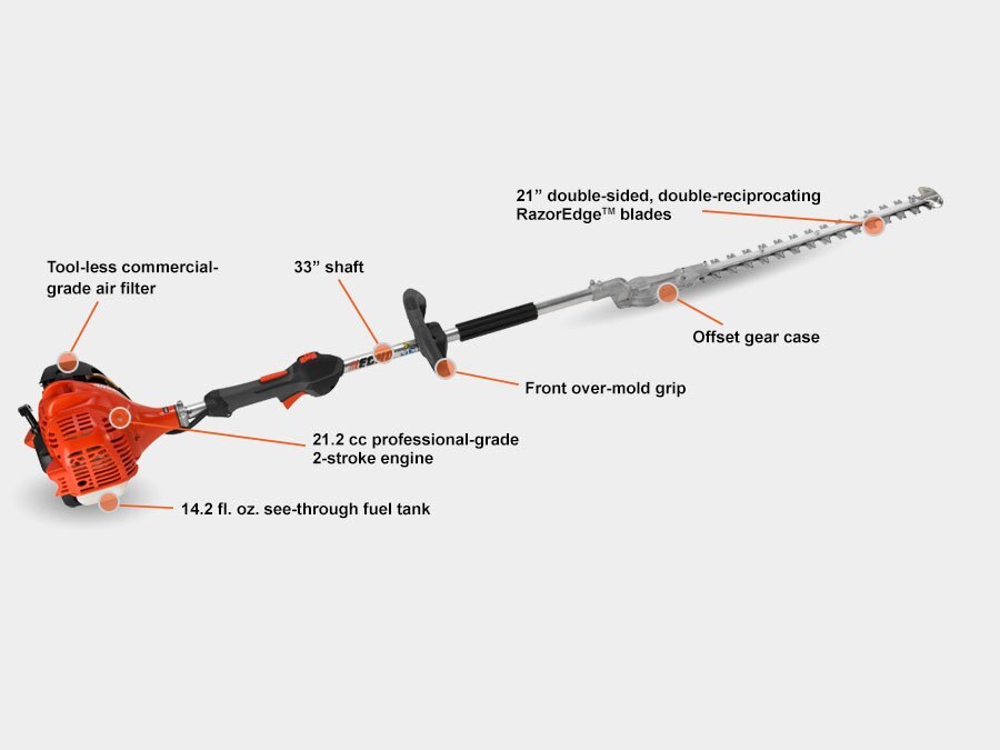 THE ANSWER FOR AWKWARD TRIMS21.2 cc professional-grade, 2-stroke engine For outstanding performance and durability 21 in. double-sided, double-reciprocating RazorEdge® blades Feature three sharpened edges for more efficient cutting i-30™ starting system Reduces starting effort by 30% Commercial-duty air filtration system Extends engine life 33 in. shaft length Provides ample reach and limits stooping to cut low growth Vibration reduction system Increases operator comfort |