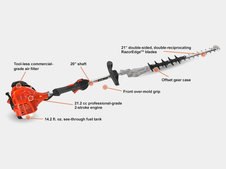 AGILITY IN AESTHETICS21.2 cc professional-grade, 2-stroke engine For outstanding performance and durability 21 in. double-sided, double-reciprocating RazorEdge® blades Feature three sharpened edges for more efficient cutting i-30™ starting system Reduces starting effort by 30% Commercial-duty air filtration system Extends engine life 20 in. shaft length Reduces weight and increases maneuverability Vibration reduction system Increases operator comfort |