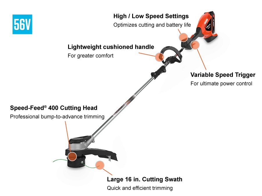 THE NEXT GENERATION OF ECHO POWERPowerful brushless motor Provides gas-like performance Lightweight with cushioned handles Easy maneuverability and increase comfort Hi/Lo speed settings To optimize cutting performance and extend battery life Variable speed throttle Matches cutting conditions 14 in. or 16 in. cutting swath Adjustable for either efficient or aggressive cutting Speed-Feed® 400 head loaded with .095 in. dia. Silentwist® trimmer line Reloads in seconds without disassembly |